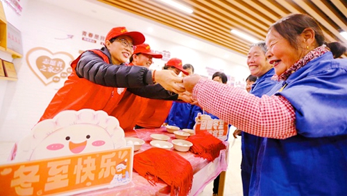12月21日,是冬至节气。江苏省扬州市鸿福社区圆梦义工协会组织志愿者开展以“冬至温暖城市美容师”为主题的爱心活动。志愿者们将热气腾腾的汤圆送给环卫工人,同时送上围巾、手套等冬季礼包。图为活动现场。