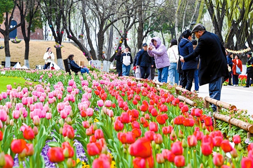 日前,在江苏南京绿博园荷兰园内,“郁金织彩,琉光捕梦”郁金香花会拉开帷幕。层层叠叠的郁金香花海在暖阳下绚烂绽放,吸引游客沉浸式感受春日浪漫。图为游客在拍照。