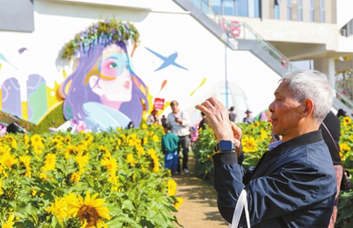 日前,江苏苏州昆山花桥地铁站南侧的新墙绘作品成新晋网红,引来不少市民到此打卡。整个彩绘作品融入了时尚的女孩、花卉、地铁、飞机、建筑等元素,色彩时尚、线条优美,治愈每一个经过的路人。图为市民在拍照。