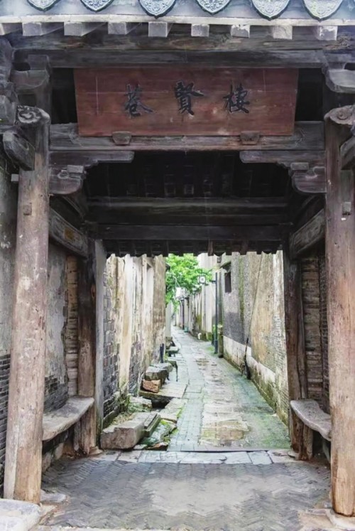 落日余晖下,东村大街中部的栖贤巷宁静悠长,巷道两旁厚重的墙壁历经风吹雨打,尽显斑驳。栖贤巷巷口设“巷门”,为明代建筑。这种设置于街巷之端的公共安全防卫设施,常为防御太湖盗贼而设。“巷门”共四根立柱,前后柱之间依墙设木板凳,供往来商客及村民歇脚或躲避风雨,如今虽略显沧桑,却依旧坚实耐用。
