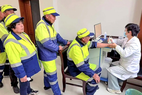 江苏省常州市天宁区环卫处近期联合天宁街道社区卫生服务中心组织开展免费健康体检和健康讲座公益活动,为近百名环卫工人送上贴心的健康服务。图为体检现场。